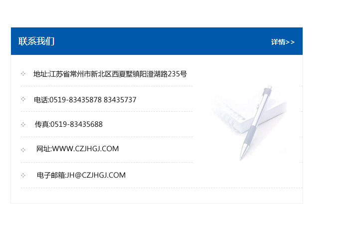 傳真:0519-83435688    郵編:213135    網址:WWW.czjhgj_com.xzyuhuayuan.com    電子郵箱:JH@czjhgj_com.xzyuhuayuan.com
